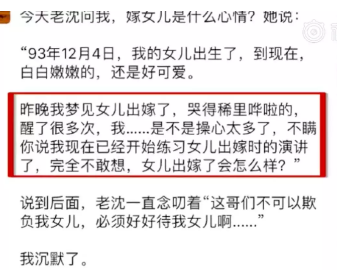 爸爸则开始在朋友圈写小作文伤怀:做梦梦到女儿出嫁,希望这位哥们儿千万不要欺负我的女儿……