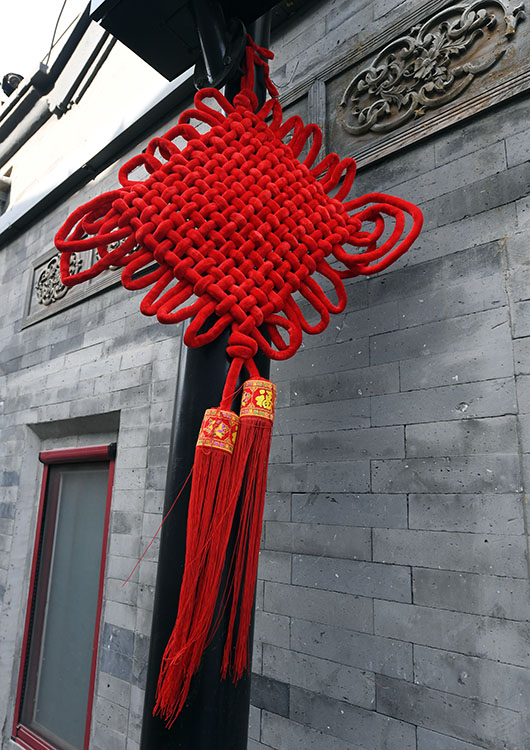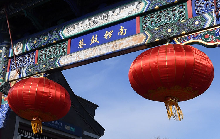 南锣鼓巷牌楼上的两个大红灯笼格外醒目。