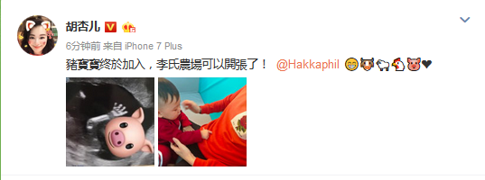 胡杏儿微博晒B超照,宣布猪年将诞下第二胎