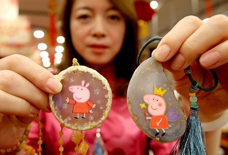 石画技师展示在玛瑙上创作的小猪佩奇吊坠。