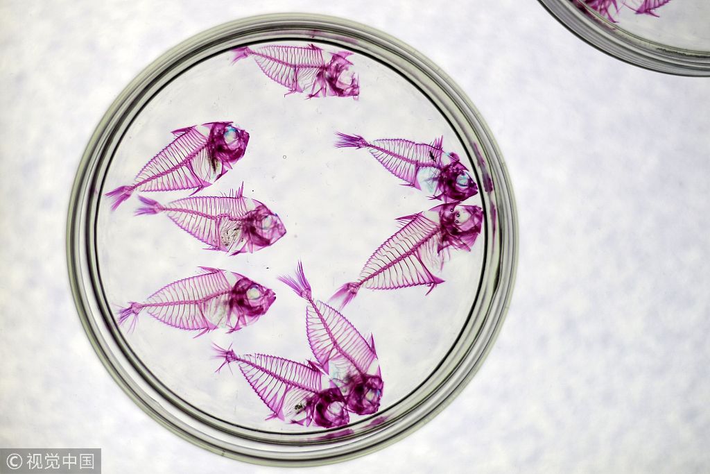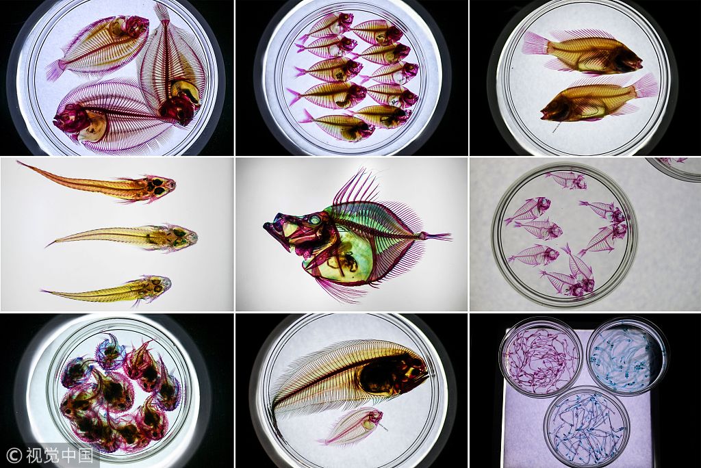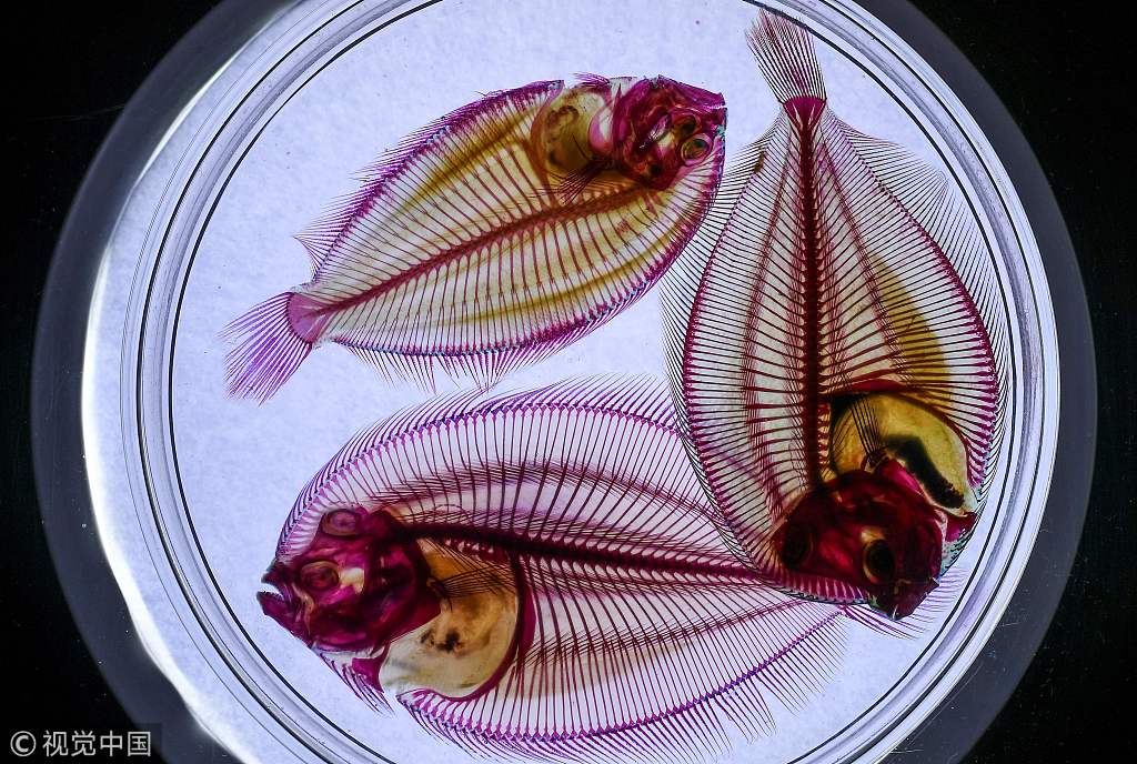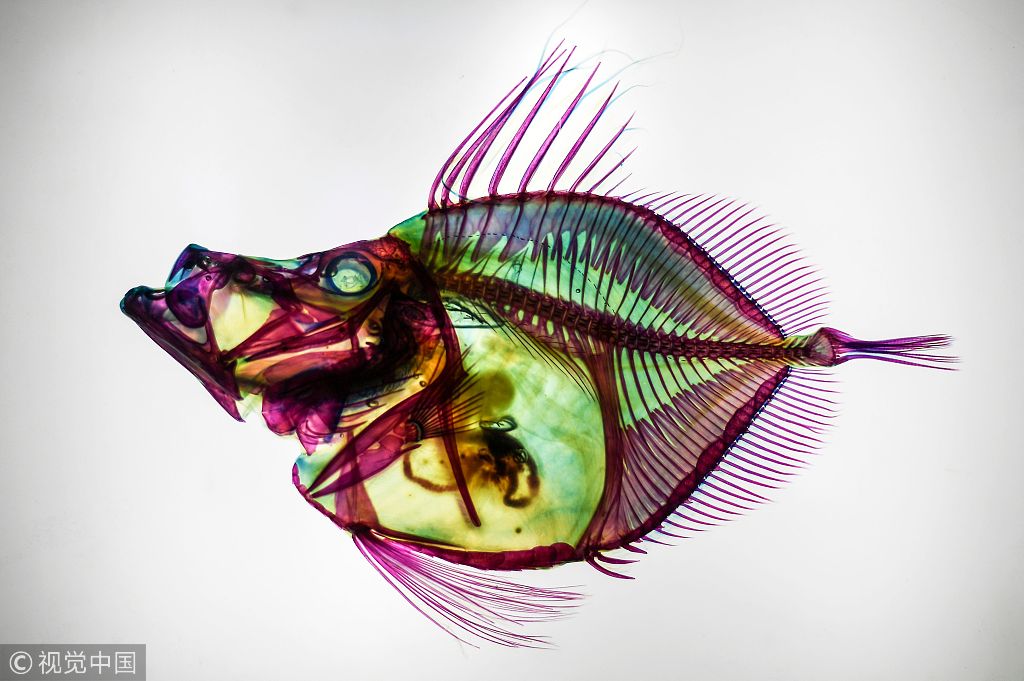 新京报讯 当地时间1月30日,马来西亚吉隆坡,吉隆坡城中城水族馆举行“透明鱼”展,水族馆利用酶将鱼的肌肉组织透明化,用特殊化学物质将鱼的软骨染色。