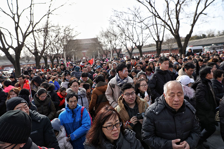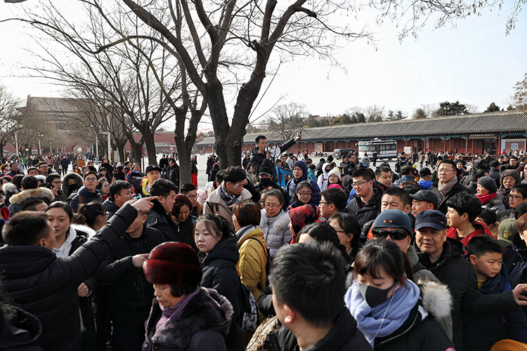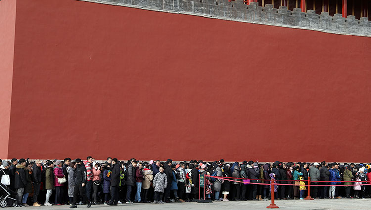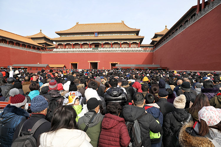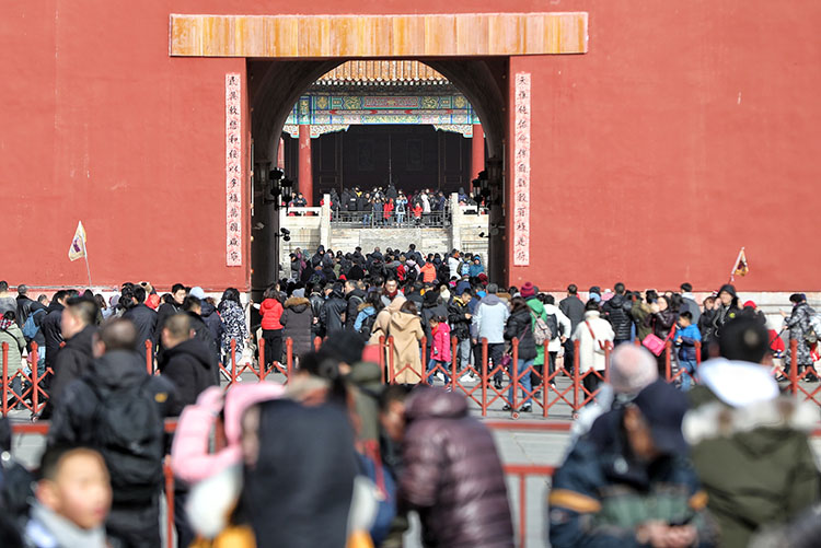 2月3日,准备游览故宫的游客仍然在午门前排起百米长队,等待安检后“进宫过年”。