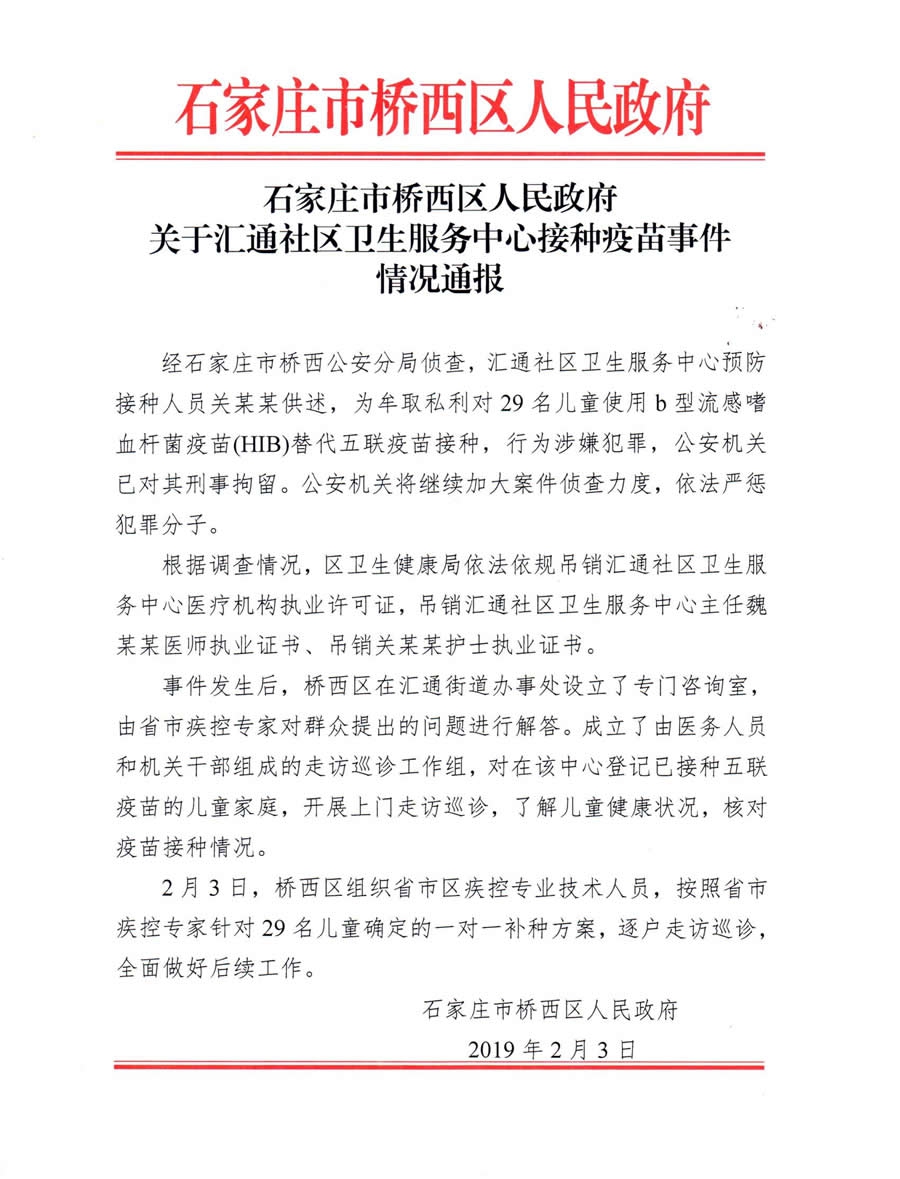 据石家庄市桥西区人民政府网站消息,经石家庄市桥西区公安分局侦查,涉案接种人员供述,为牟取私利,对29名儿童使用b型流感嗜血杆菌疫苗(HIB)替代五联疫苗接种。详情>>>