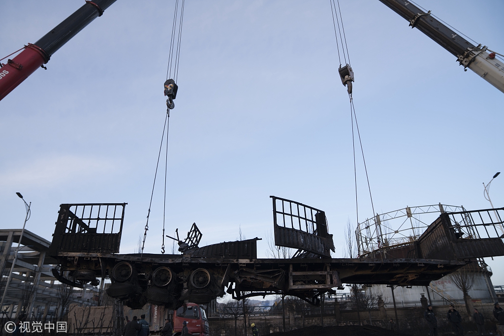 吊车清理爆炸车辆。图片来源/视觉中国