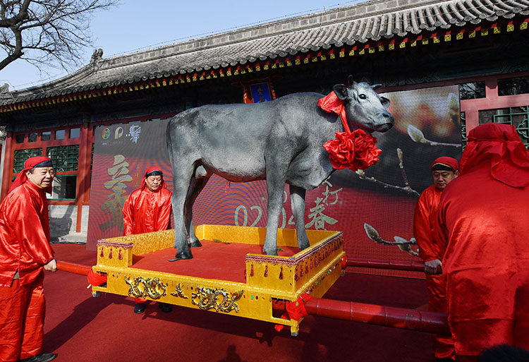 新京报讯 2月4日,立春日恰逢除夕,东城区建国门街道第十三届立春文化节“风车迎春 鞭打春牛”仪式在北京古观象台举行。11时14分14秒,北京天文馆馆长、古观象台台长朱进宣告立春吉时。参加活动的金牌小巷管家和居民代表挥鞭打春牛。鞭牛过后,“牧童”将牛肚子里装满杂粮的福袋掏出,分发给现场居民和嘉宾,寓意五谷丰登、风调雨顺。