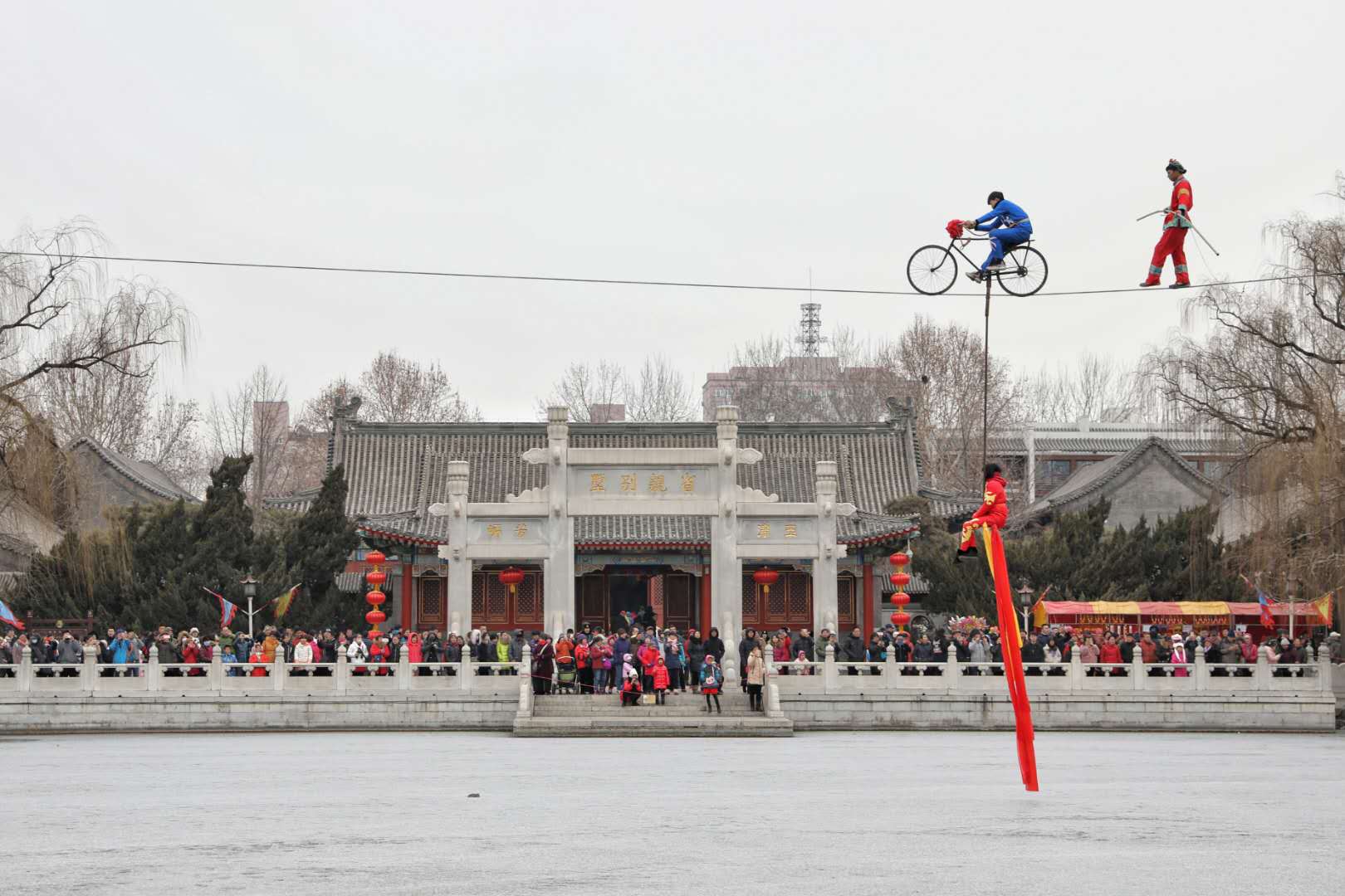 市民在大观园红楼庙会上观看高空特技表演。新京报记者 王飞 摄