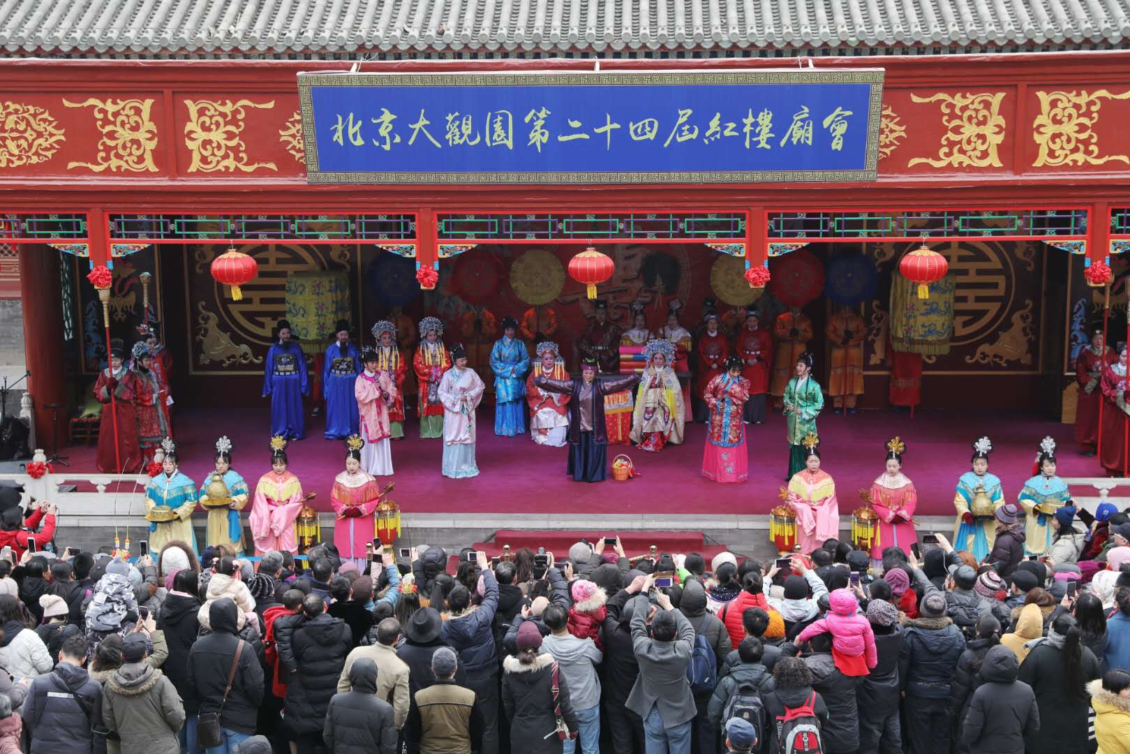 据了解,大观园红楼庙会期间,大观园大舞台、小舞台、南门广场、湖心岛五个地点轮番上演丰富多彩的文化节目。每天上午9时30分,准时再现贾元春省亲场面。