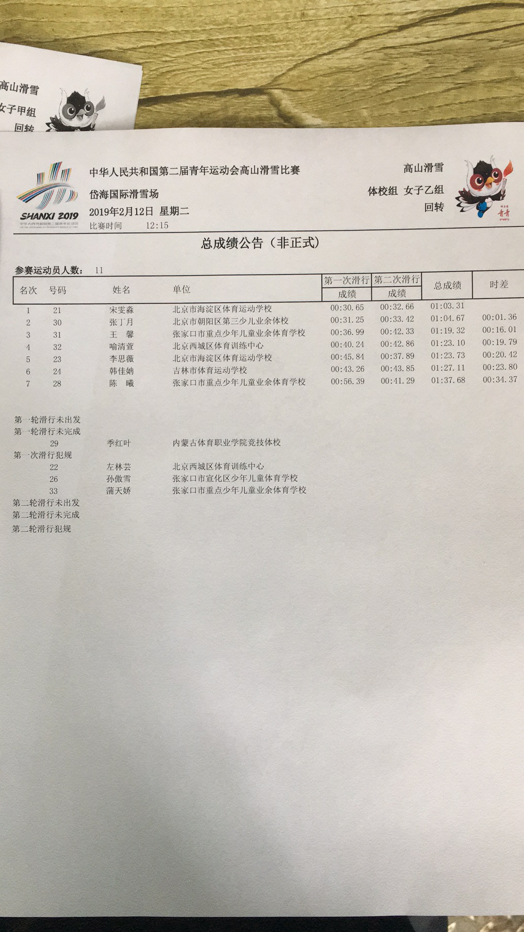 女子乙组成绩表。