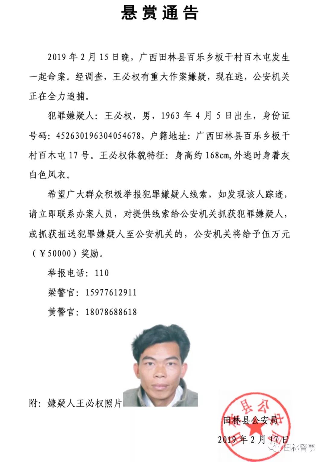 2019年2月15日晚,广西田林县百乐乡板干村百木屯发生一起命案。经调查,王必权有重大作案嫌疑,现在逃,公安机关正在全力追捕。