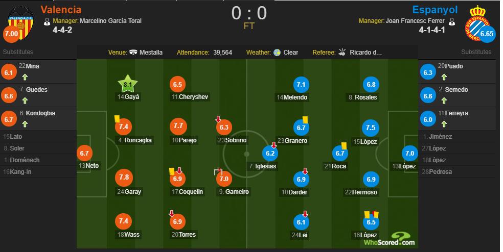 皮亚蒂和加西亚的受伤令武磊在本场比赛得到了首发机会,但面对瓦伦西亚,和伊格莱西亚斯、梅伦多组成前场三叉戟的武磊显得有些孤独。从比赛开始到自己第71分钟被换下,出任左边锋的武磊为球队贡献的数据是1次射门、1次抢断和13脚传球。尽管他第51分钟的头球冲顶颇具威胁,跑动也十分积极,总奔跑距离达到8.5公里,但西班牙媒体赛后依然给出了6.1分,是双方首发队员中的最低分。