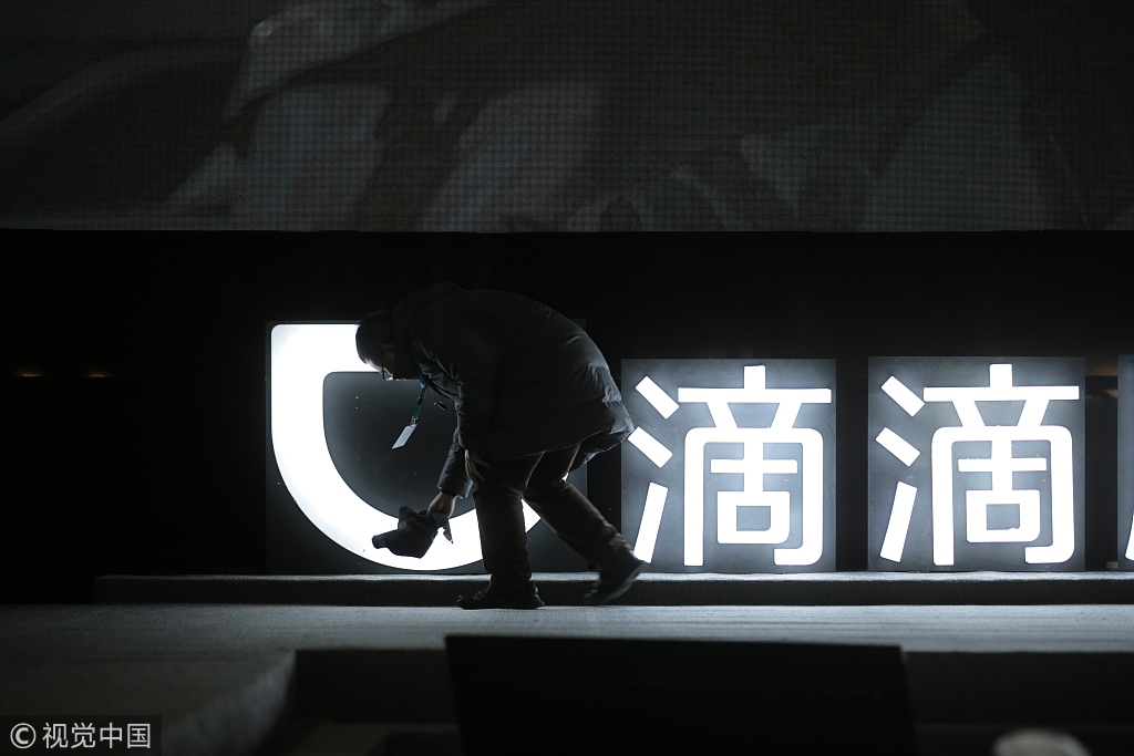 2018年1月24日,北京,滴滴顺风车“轻春运”活动启动仪式前,工作人员擦拭现场吸塑字。