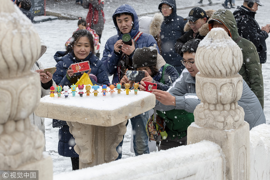 ▲2019年02月14日,北京,一些游人和摄影师在雪中故宫摆上故宫文创产品中的动漫角色拍照。图片来源/视觉中国