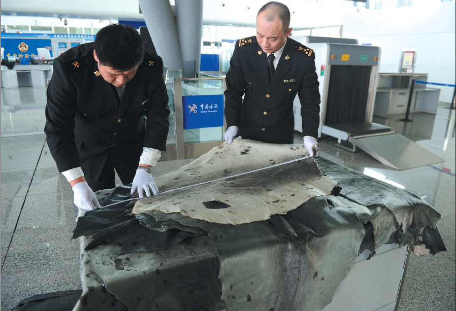多地曾发生过和斑海豹有关的案件,图为2015年11月30日,乌鲁木齐机场海关工作人员查获斑海豹皮。资料图片/视觉中国