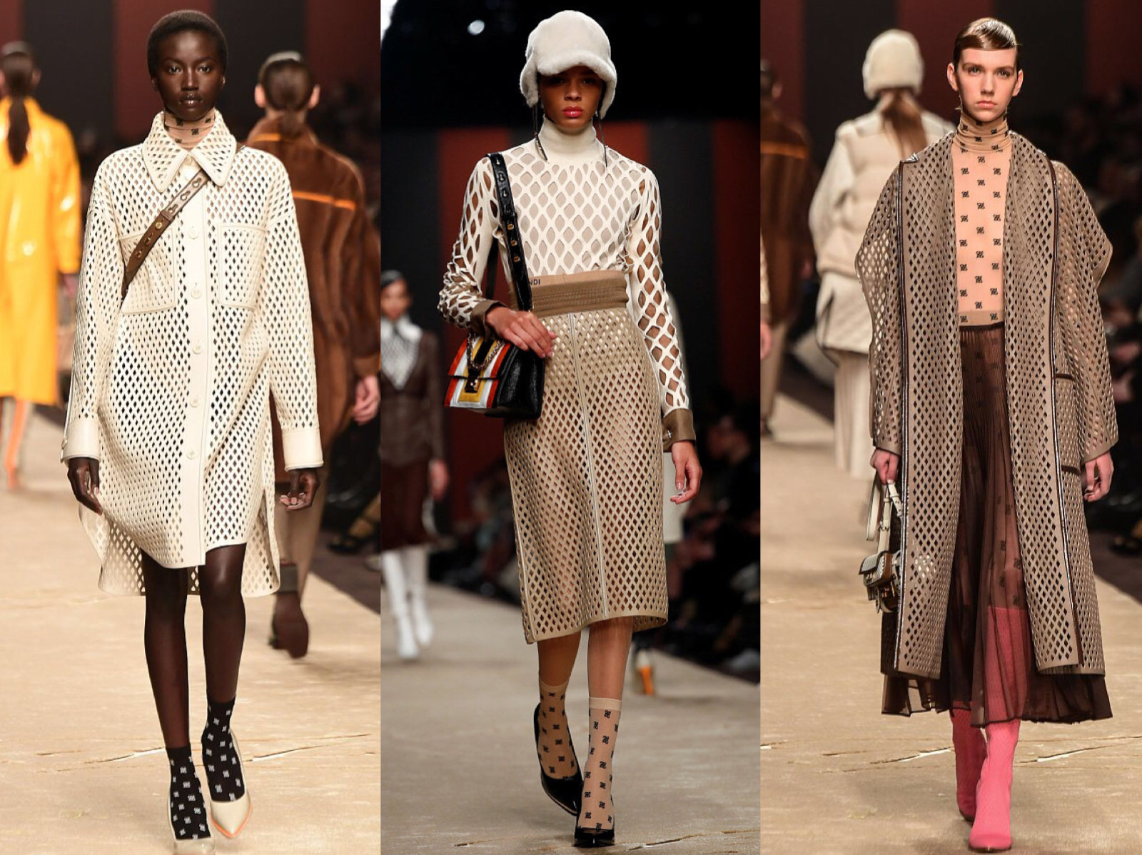 昨日,多款镂空皮质的服装也给人留下了深刻印象。实际上,镂空皮质的元素也并不是Karl首次使用。在FENDI2019春夏系列中,在不同纹理材质拼接的飞行员夹克中,他就运用了镂空的皮条设计。以极简的廓形与镂空的设计相结合,呈现出精致的艺术感。镂空时装也成为通透、个性的代名词。