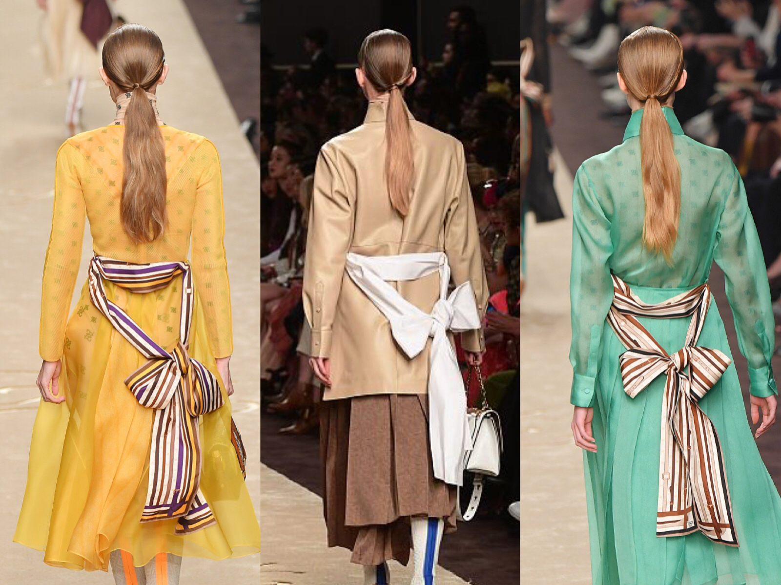 在这最后的一场女装秀中,Karl将女性的柔美和少女心统统留给了转身的另一面。彩条蝴蝶结的绑带设计,贯穿了多款成衣。无论是丝质连衣裙还是正面中性风的衬衫,都留下了这样一缕轻柔与甜美。