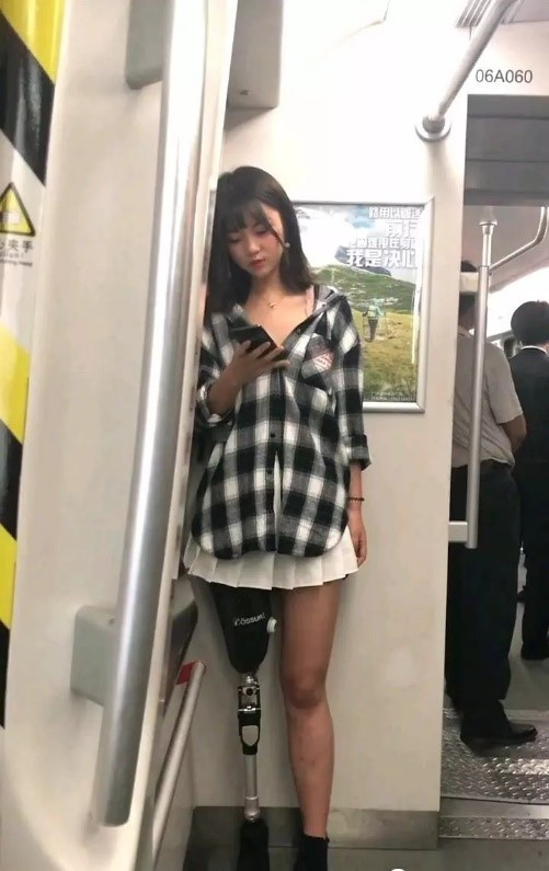 无独有偶,在国内的社交媒体上,最近也有一张走红的地铁照片。照片中装假肢的年轻女孩丝毫不在意周围人的目光,穿着短裙,大方地展示着自己的躯体之美。这张照片目前已经在豆瓣上被大量转发点赞,据豆瓣网友评论所说,这个女孩经常在抖音上发布视频,生活非常幸福自信。(这张图片也是从视频中截取的,并非网友私自拍摄)