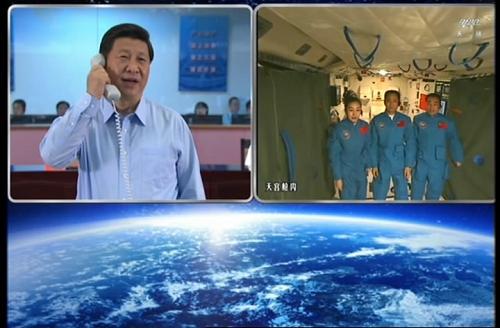 2013年6月24日,习近平同正在天宫一号执行任务的三位航天员进行天地通话。