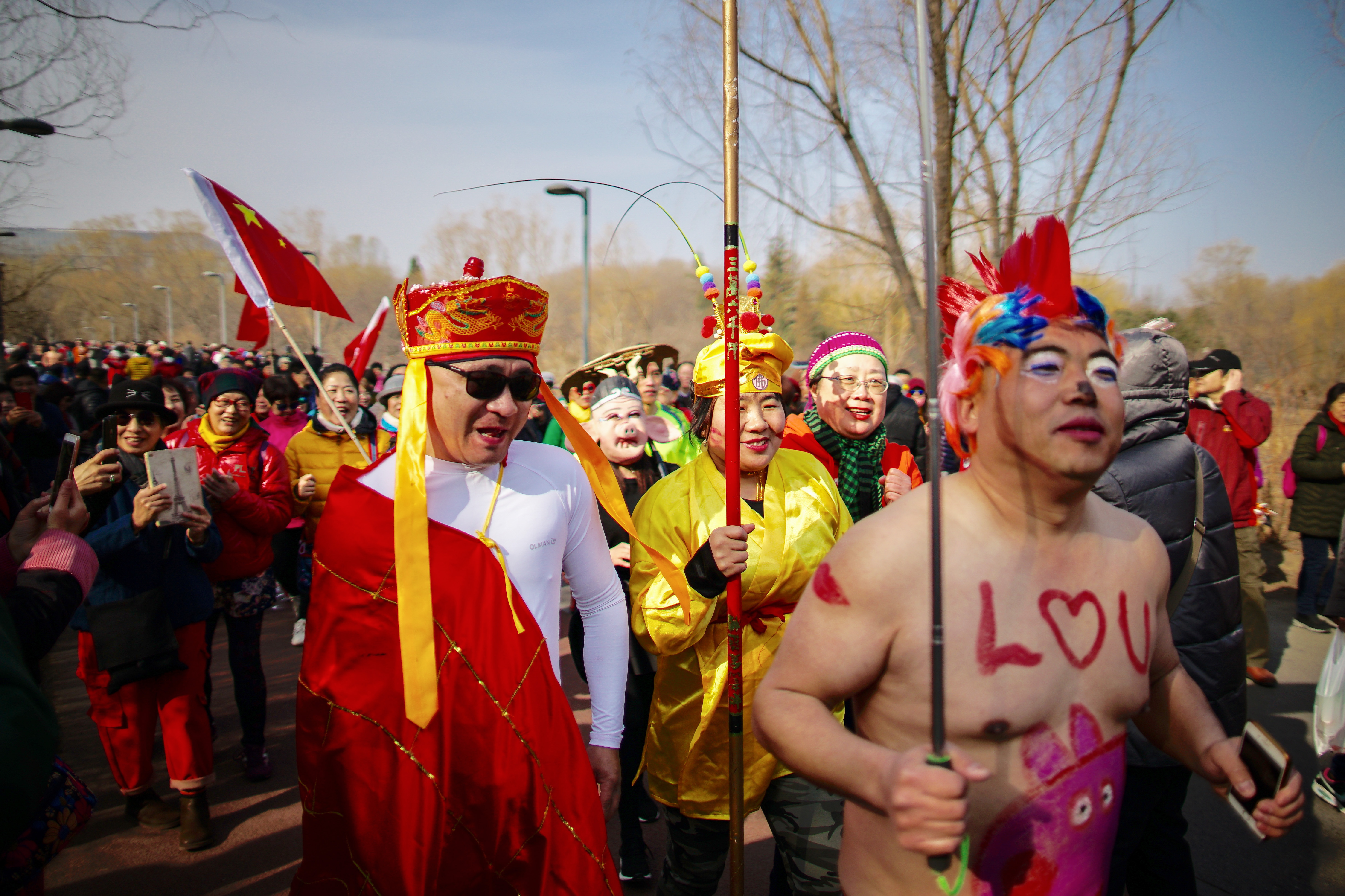 “光猪跑”的参赛选手,在人群中备受瞩目。四名《西游记》中唐僧师徒扮相的选手在开跑前,被十来个观众围起来,和他们一一合影。寒风中,“唐僧”裸露的双腿微微打颤。