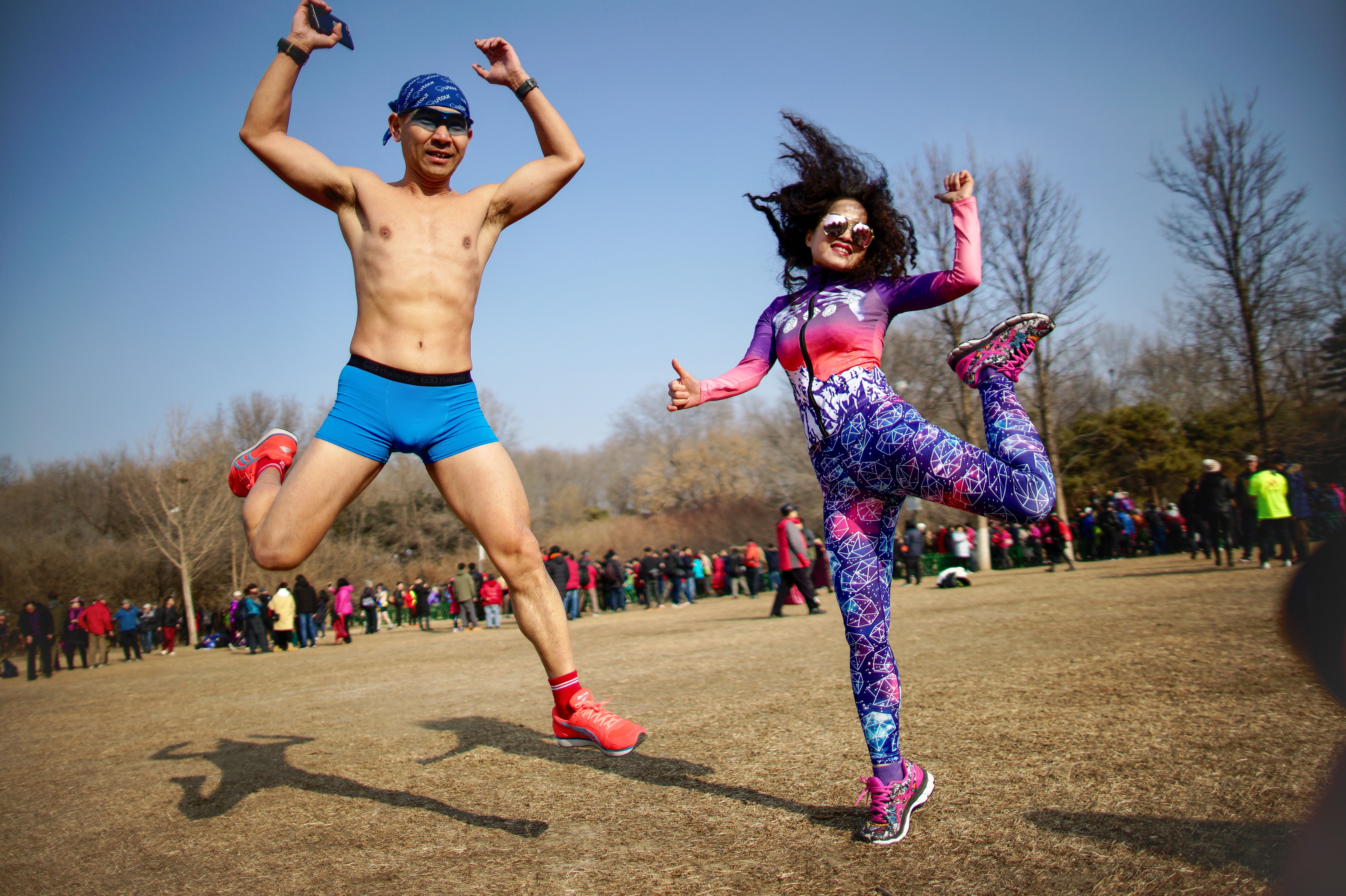 开跑前,跑步者凹造型拍照留念。新京报记者 郑新洽 摄