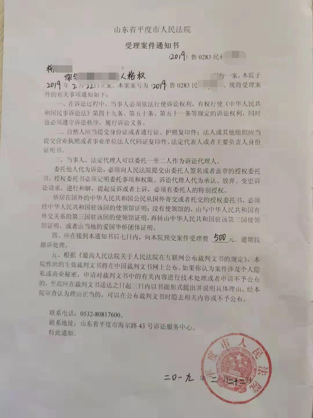 柳孔圣提供的受理案件通知书显示,平度市人民法院已受理该起案件,将择日开庭。