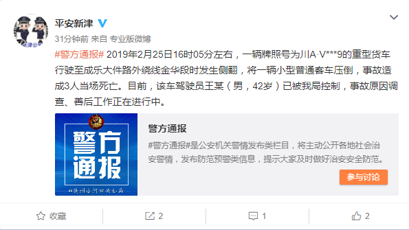 新京报快讯 据四川省成都市新津县公安局官方微博消息,25日16时05分左右,一辆牌照号为川A·V***9的重型货车行驶至成乐大件路外绕线金华段时发生侧翻,将一辆小型普通客车压倒,事故造成3人当场死亡。目前,该车驾驶员王某(男,42岁)已被控制,事故原因调查、善后工作正在进行中。