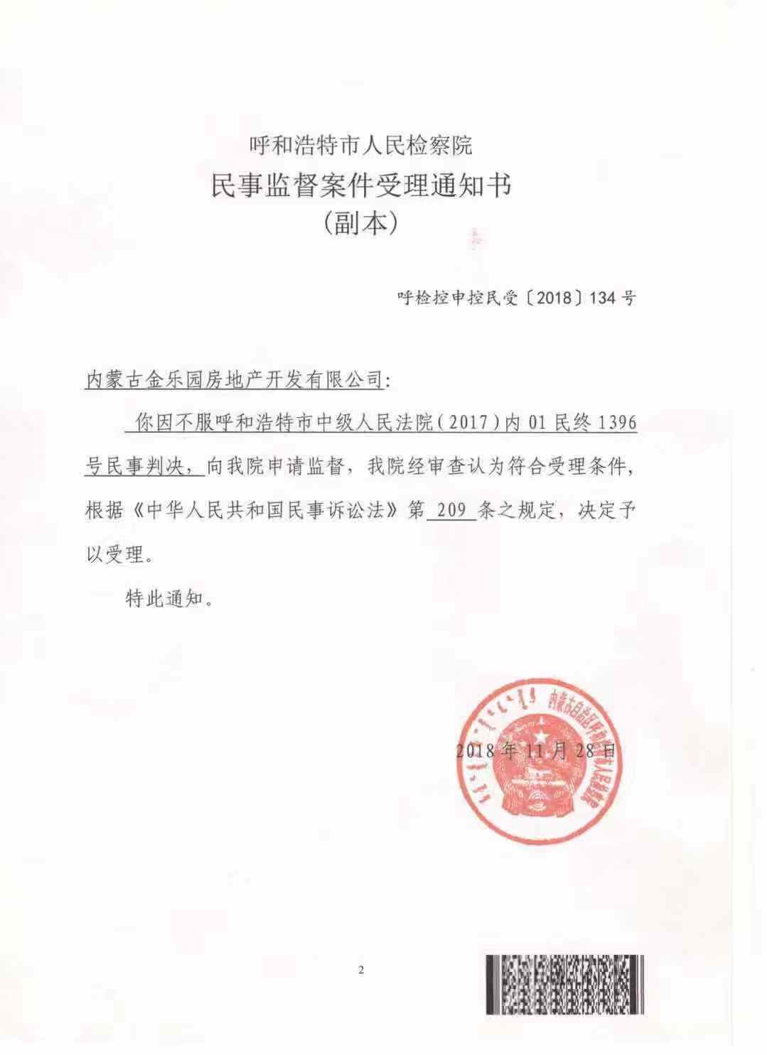 2018年3月,金乐园公司向内蒙古高院提出申诉,后被驳回,2018年11月,该公司向呼和浩特检察院提出监督申请,要求检方就此事提起抗诉或者检察建议,启动案件再审,检方已经受理了该申请,目前案件正在审查之中。