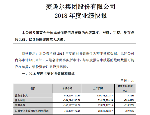 新京报快讯(记者 郭铁)2月28日,新疆乳制品与连锁烘焙品牌麦趣尔发布2018年业绩快报显示,其营收为6.13亿元,同比增长5.81%;净利润为-1.64亿元,同比下降969.05%。这是麦趣尔2009年以来的首次亏损,也是年度业绩下滑幅度最大的一次。