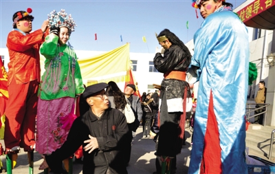 昨日下午,在朝阳区孙河乡上辛堡村春季庙会表演间歇,村里一名20多岁的男青年找到高跷会的老会长沈文喜,称:“沈三爷,我想跟您学高跷本事。”