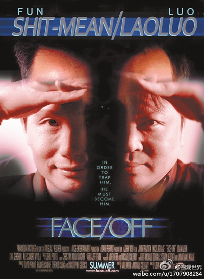 网友“@围观世界”PS《变脸》海报调侃罗永浩、方舟子网络骂战。