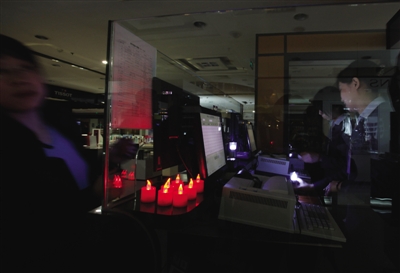 往年的“地球一小时”活动,当代商城一层收银台点着电子蜡烛照明。本报记者 孙纯霞 摄