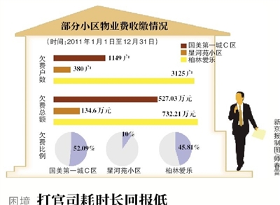 其次,一家物业公司的经理坦言,将业主告到法院后,需要立案期、答辩期,业主也要时间搜集证据。因此诉讼过程很漫长,“如果官司打赢了,业主交了今年的钱,但打官司拖一年,则又欠了一年。”包华说,这种问题在经历了诉讼的物业和业主间普遍存在,法院哪怕同时收10个案子,如果3个月一结案,一年也只能告4次。而这一年过去,这些业主又欠了一年费。
