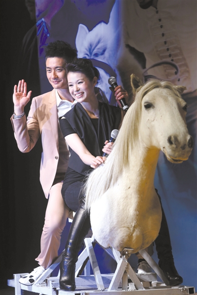 黄宗泽与胡杏儿骑着道具马亮相发布会。本报记者 薛珺 摄
