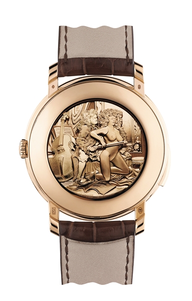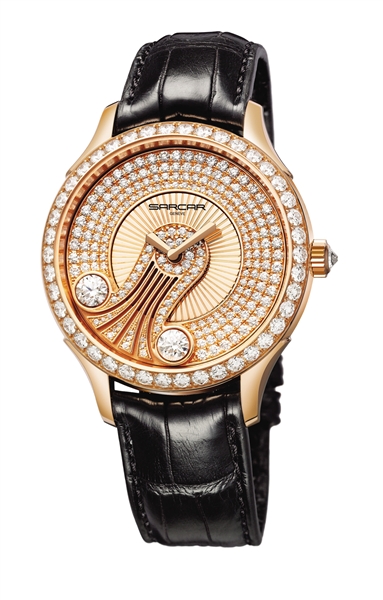 豪门世家近日发布最新表款尊显里拉琴音腕表系列。透过蓝宝石玻璃表面,一把镶满钻石的红金里拉琴旋转于40毫米表盘之上,18K红金表盘环形镶嵌约361颗切割完美的钻石,如同散落人间的神曲音符。图11(许海玉)