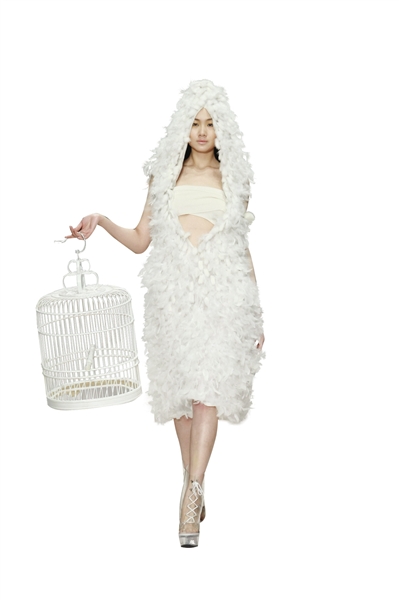 清华大学在北京发布美术学院2012届服装专业毕业设计作品,亮相的55件作品来自22位年轻设计师,通过新兴材料的尝试和独特造型手法诠释对当代社会形态的洞察和反思。图7/9(巫倩姿)