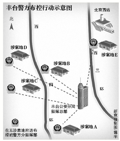 前日6时,丰台警方布控,28个派出所全程协同办案;9时30分行动开始,700余名警员分7组,突查两团伙的5个办公区。