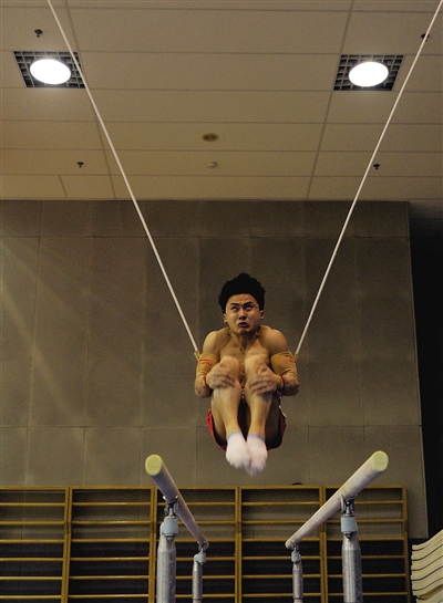 昨日,中国男子体操队选手冯喆在练习双杠。 新华社记者 王毓国 摄