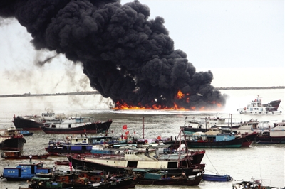 昨日14时30分左右,珠海香洲渔港“粤珠海7018号”供油船爆炸起火,船上3人获救,1人受轻伤。火势顺着泄漏的油污蔓延,海面上呈现一条长长的着火带。消防人员经过两个多小时的奋力扑救,终于扑灭。目前事故原因正在调查当中。 赵梓 摄