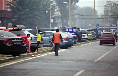 没有制服,地上没有画停车线,周边也没有停车收费的牌子。很多司机虽然觉得不太靠谱,但碍于公园西门的停车位不够,还是在该男子的指挥下把车停到了马路边。