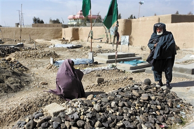 罗希拉因为读诗被发现而自焚。图为父母在罗希拉的坟墓旁。