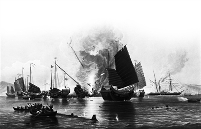 鸦片战争中,一艘清军战船被英舰击中。英国画师爱德华·邓肯油画作品,绘于1843年。