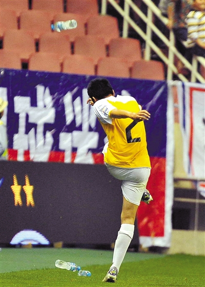 申鑫队员被罚下后,怒踢场边的矿泉水瓶。