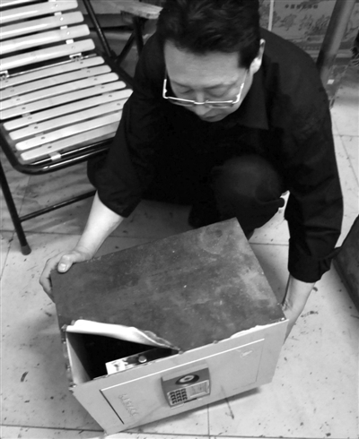 保险箱被撬开一大洞。近日海淀一市场多家商户被盗,警方已介入调查。实习生 刘梦 摄