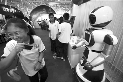 “会认人的机器人”吸引了很多小朋友的目光。经过“走近机器人、人脸扫描、输入你的信息”几道程序,这台机器人便能记住你。