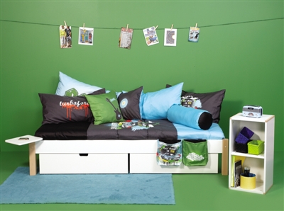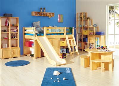 一件儿童家具要适合25岁以下的所有人群?以儿童床为例,可变换的儿童床,它可以是一张和滑梯组合的高架床;也可以是一个带攀登架的上下床;还可以和书桌、柜子等组合成L形、一字形的套装家具,一张儿童床可以在组合变化中伴随孩子从少年到青年。