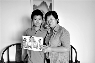 昨日,武王昊天拿起画笔,为当老师的妈妈王欣画了一幅画。画面中,妈妈坐在中间,桌前一盘粉桃,一盘紫李,两个学生各自敬礼,昊天还附上祝福语,“祝妈妈桃李满天下”。