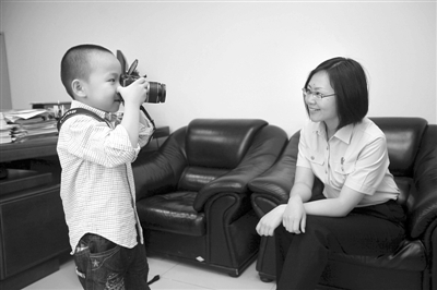 两腿叉开身体后仰,一会眯左眼,一会眯右眼,5岁的李近山要给妈妈胡羽来张靓照当礼物。见妈妈右手叉腰摆POSE,李近山“唠叨”起来,“你说你是女孩子,照相要温柔一点,你自己想想什么姿势好……”他一串口齿不清的话惹得家人大笑。