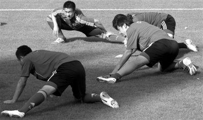 训练刚开始阶段,国足照例进行了压腿等拉伸训练。本版图片/Osports
