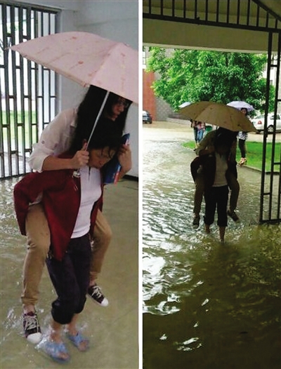 再说说女大学生,一点刚刚没过脚踝的积水居然就成为了大家上学路上的拦路虎,也就因为这一点点积水,就能够理所当然地接受清洁阿姨的帮助,让年纪和自己父母差不多的清洁阿姨背着自己趟水上学。为了求知,在这温度不高不低的初夏,你就不能脱掉那双鞋自己趟过去吗?