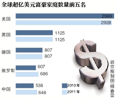 同时,中国财产超过一亿美元的超级富豪家庭比去年多了110户,增长20%。美国财经杂志《福布斯》评论称,“这一点很值得注意,2009年中国在超级富豪人数榜上还是第13位,没有一个国家实现过这样的跳跃。”