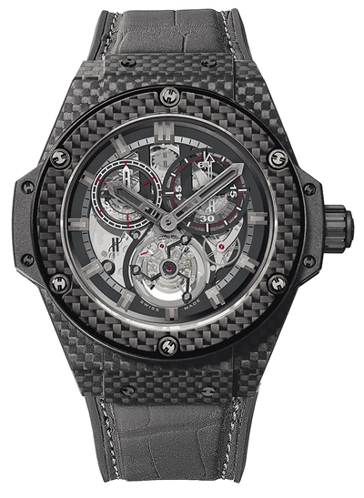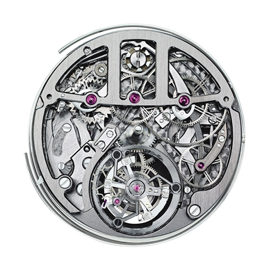 宇舶“大教堂”三问陀飞轮与柱轮计时码表:表壳与机芯机板完全由碳纤维制成,其中表壳还采用了钛和天然橡胶等材料,是一款融陀飞轮与柱轮计时码表为一体的高复杂腕表。